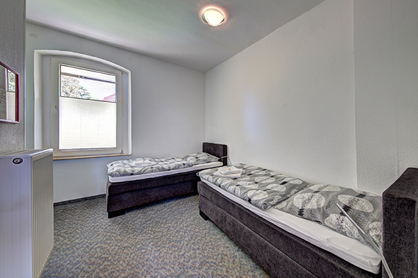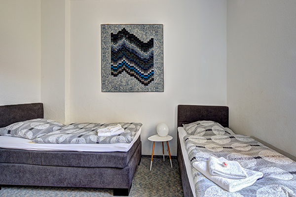 Bettwäsche, zwei Einzelbetten (100x200 cm) und Kleiderschrank.