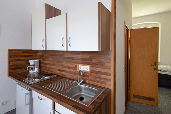 Kühlschrank, Geschirrschränke, Kaffeemaschine, Kochgelegenheit,